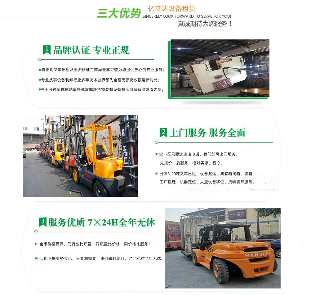 亿立达设备租赁有限公司是工商局准许的北京青年政治学院专业叉车出租公司,公司本着诚信、服务、效率、创新的经营理念,用精湛的技术,真诚的服务,为众多客户提供优质的服务,同时获得信赖与支持。专业提供北京青年政治学院3-20吨叉车出租、叉车租赁、设备搬运、集装箱掏箱装箱、机器移位定位、货物装卸、工厂搬迁、安全可靠,收费透明,价格便宜,随叫随到,24小时上门服务!本公司叉车吊车师傅对各种设备搬运装卸都有深刻探讨和研究。很多的疑难设备搬运,通过我公司的叉车师傅都能迎刃而解。对各种进口设备、国产机器、大型设备搬迁、高难度搬迁、各种精密仪器、医疗设备、科研设备等都能搬运; 提供全市 24 小时上门装卸搬运服务。同时提供厂房搬迁服务。 ...